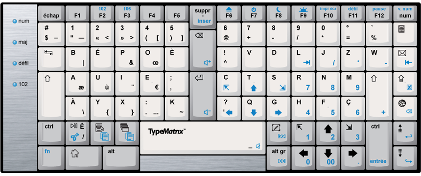 - Un nombre inégalé de touches mortes pour taper toutes sortes de diacritiques (ce qui permet de taper tous les caractères des langues européennes utilisant l’alphabet latin), les caractères grecs, les symboles scientifiques, les exposants, les indices, etc.