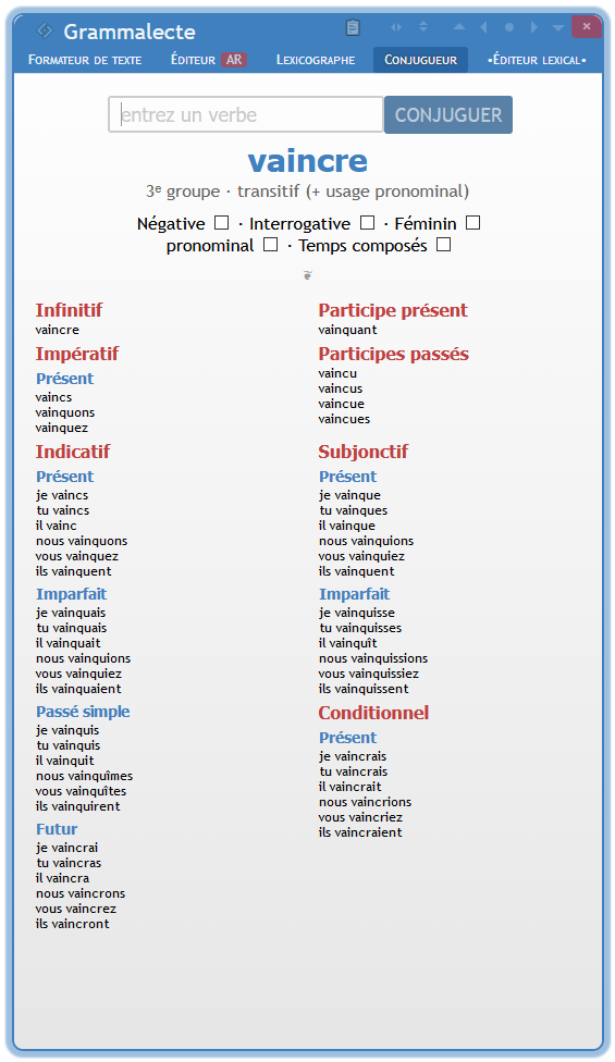 Conjugue tous les verbes inclus dans le dictionnaire (environ 8000).