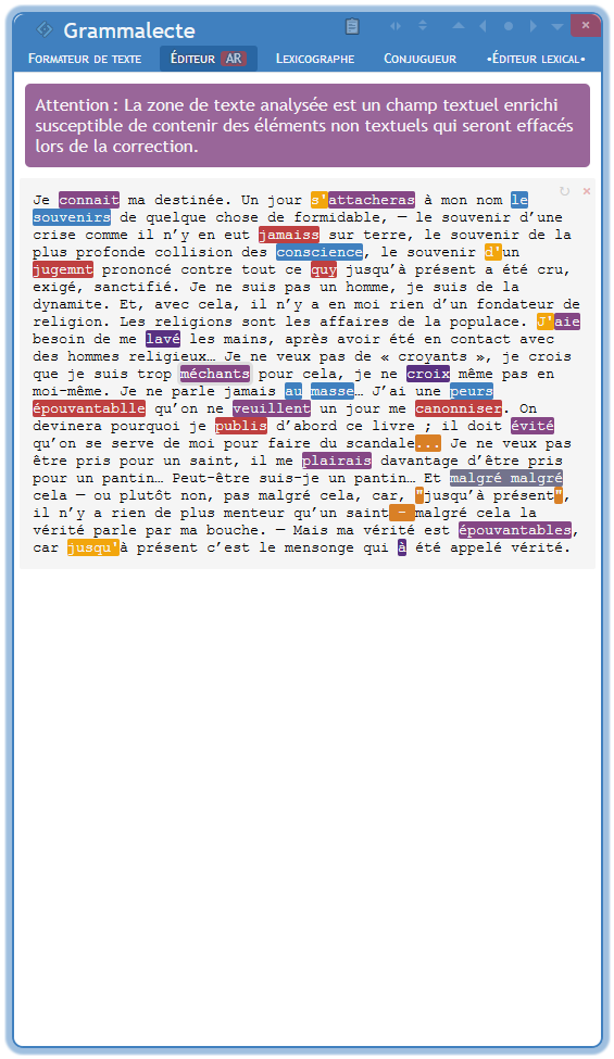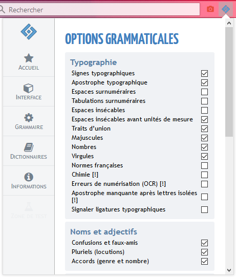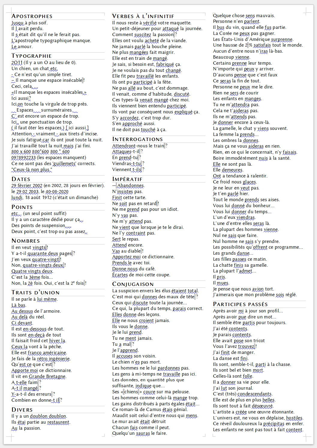 - Faux positifs : Même si le risque de faux positifs a été minimisé autant que faire se peut, il n’est malheureusement pas possible de les éradiquer complètement, le correcteur peut se tromper et proposer quelque chose qui n’est pas adapté à la situation (lire la FAQ pour plus de détails). Demeurez donc vigilants.