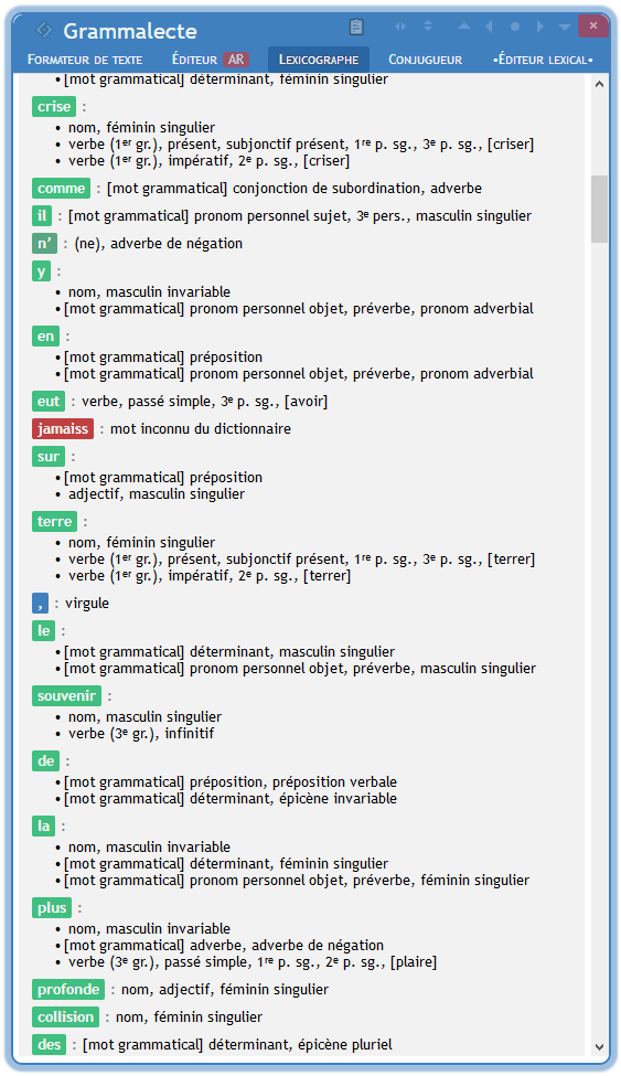 Outil simple qui renseigne sur la nature grammaticale du mot sur lequel se trouve le curseur.