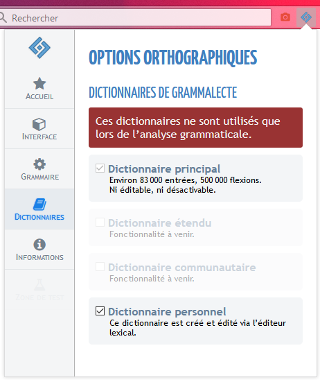Grammalecte et les dictionnaires orthographiques sont téléchargeables sous forme d’extension et ne fonctionnent qu’avec LibreOffice ou OpenOffice. Il existe plusieurs versions de Grammalecte. Veillez à télécharger celle pour votre logiciel.