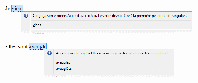 - Chevauchement des erreurs : Avec Writer, il peut arriver, lorsque deux erreurs se chevauchent, que la correction choisie s’applique sur la zone des deux erreurs au lieu d’une seule. (Ce problème est rare, tout étant fait pour l’éviter.)